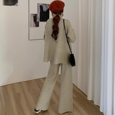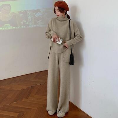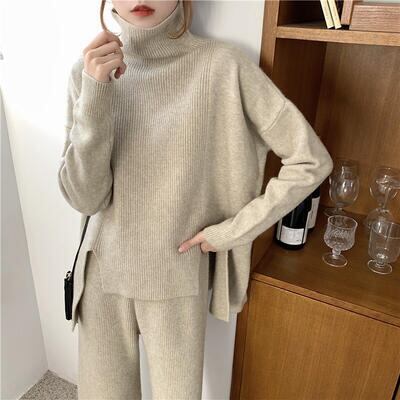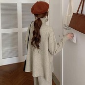 ハイネックのニットとパンツのセットアップ。