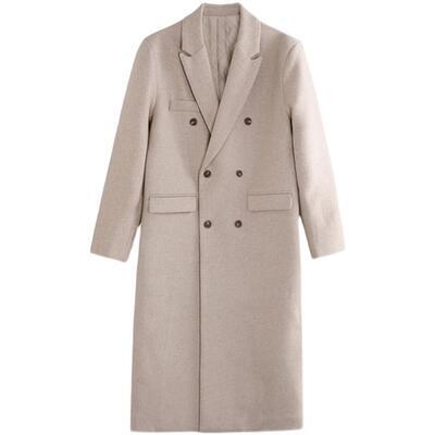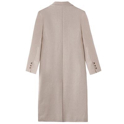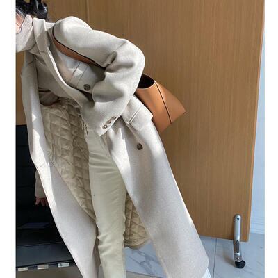 ナチュラルカラーのロング丈チェスターコート。