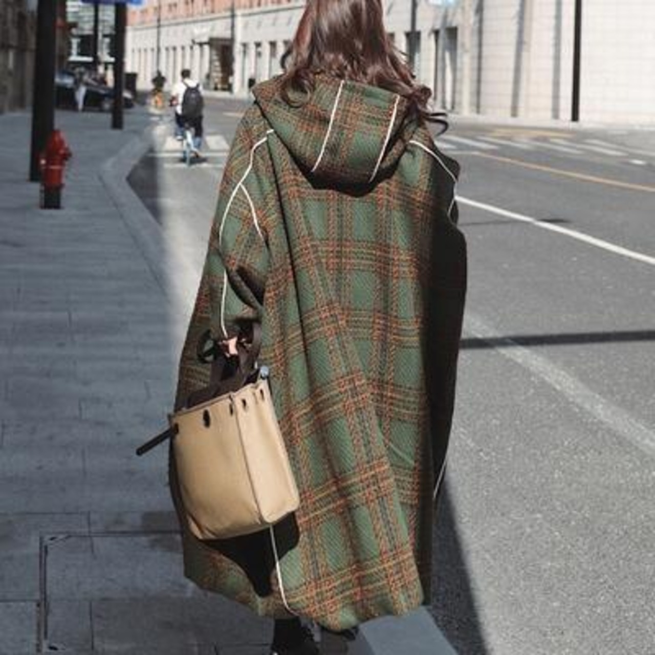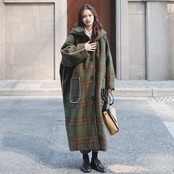 オーバーサイズのフード付きチェック柄コート。