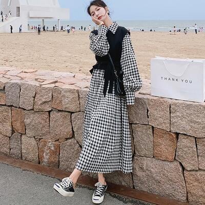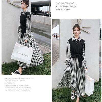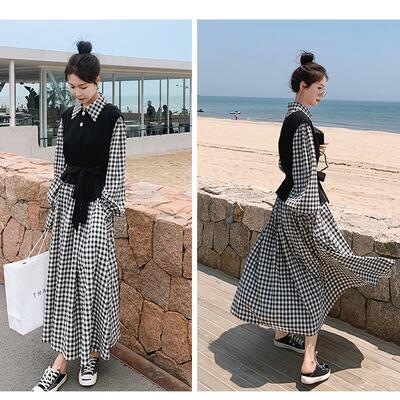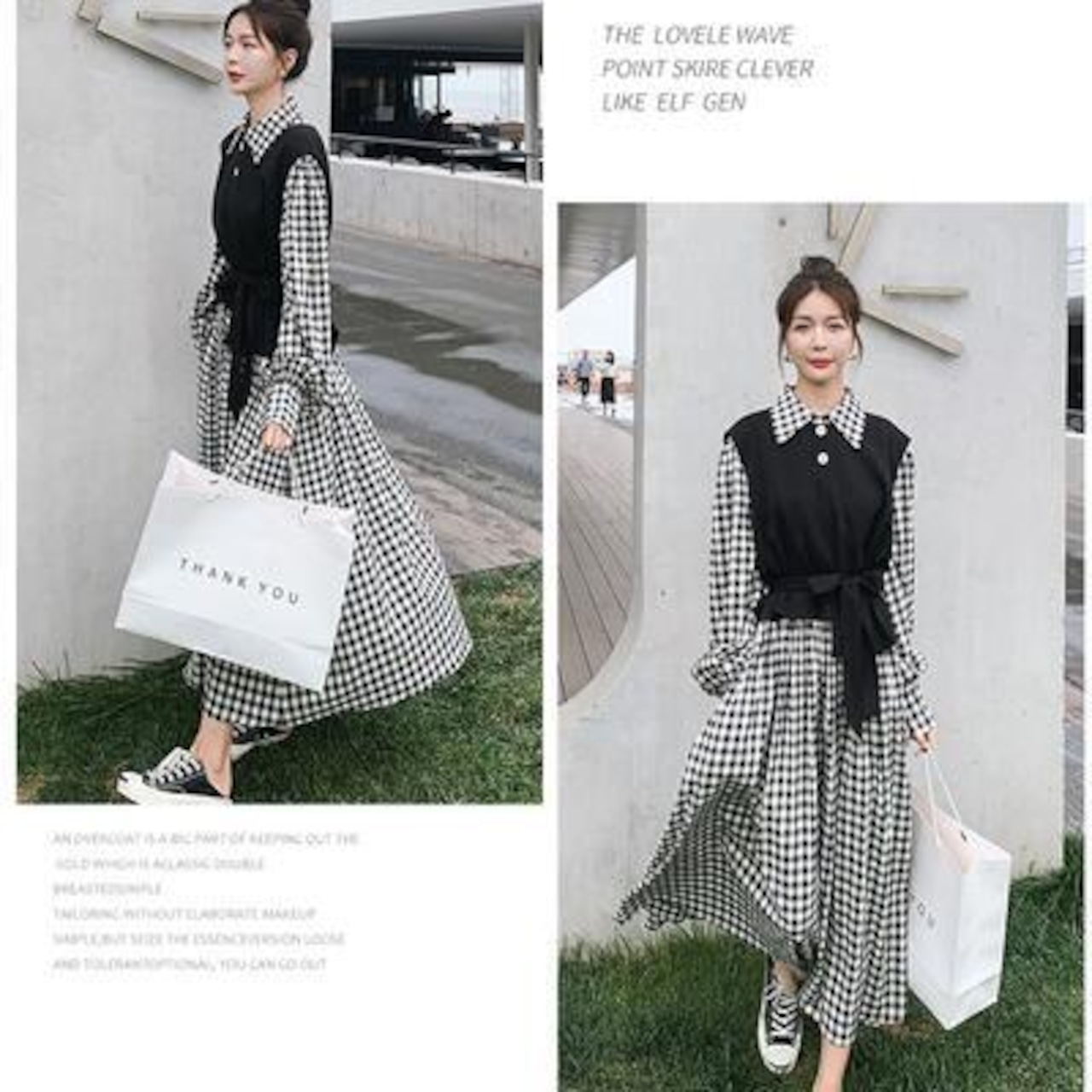 大きいサイズレイヤード ワンピース 2点セット セットアップ レディース ベスト 長袖 ギンガムチェック きれいめ カジュアル シャツワンピ ロング丈 おしゃれ 可愛い フェミニン ワンピ ドレス ブラック 黒 春 秋 冬 20代 30代 40代 50代