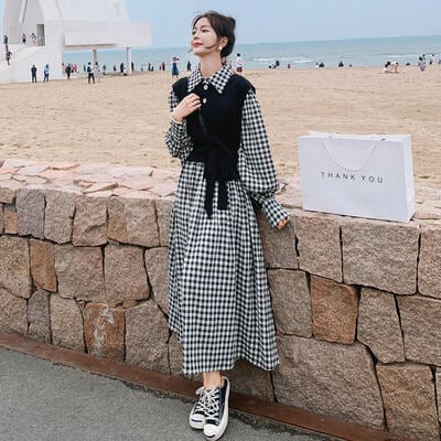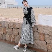 ギンガムチェック柄のシャツワンピにベストをレイヤードしたワンピース。