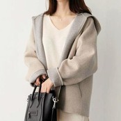 シンプルなデザインのフード付きショートコート。