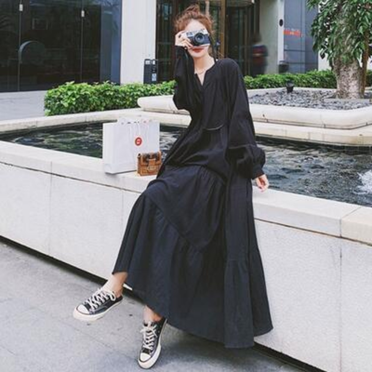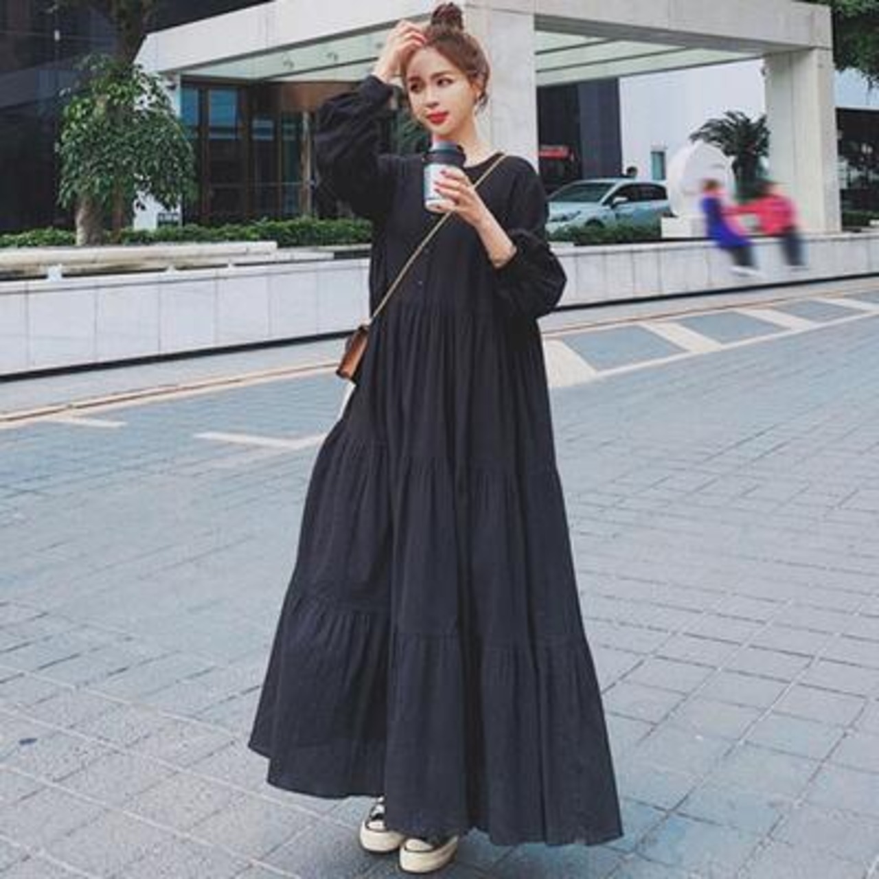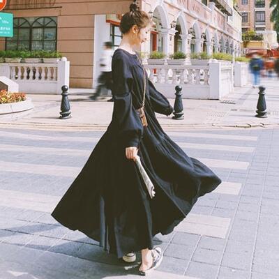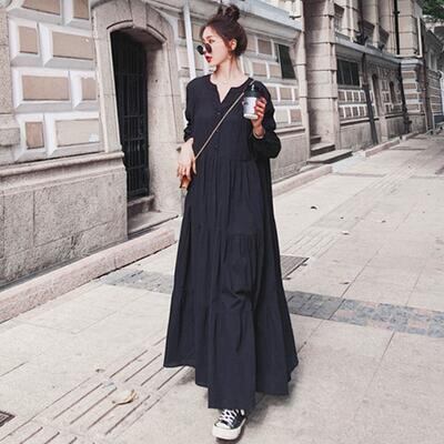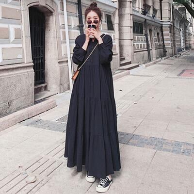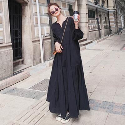 ティアード ワンピース ロングワンピ レディース 袖あり 長袖 きれいめ カジュアル ロング丈 おしゃれ 可愛い シンプル フェミニン ワンピ ドレス ゆったり 体型カバー リラックス 大きいサイズ ブラック 黒 春 秋 冬 20代 30代 40代 50代
