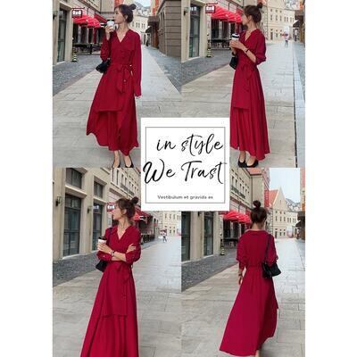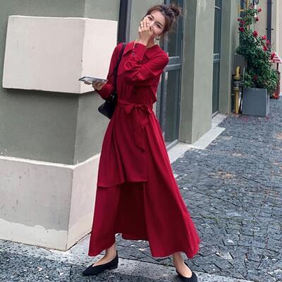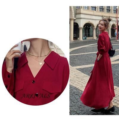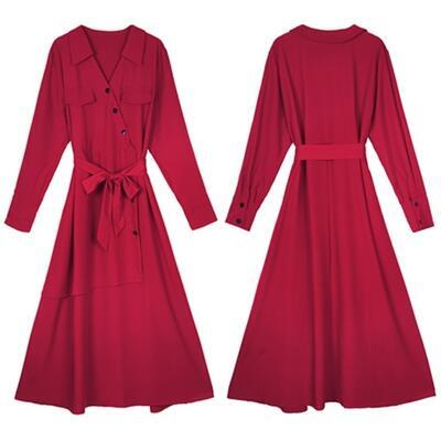 全2色 ウエストリボン 大きいサイズ エレガント ワンピース ロングワンピ レディース アシンメトリー 袖あり 長袖 きれいめ カジュアル ロング丈 シャツワンピ Vネック おしゃれ 可愛い フェミニン ワンピ ドレス ハイウエスト レッド 赤 ブラック 黒 春 秋 冬 20代 30代 40代 50代