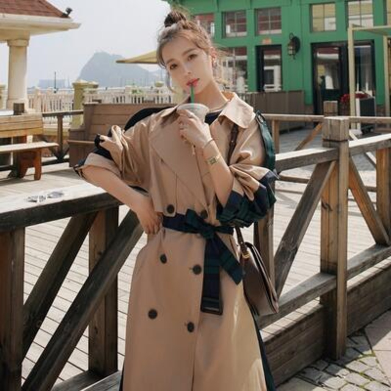前後の切り替えデザインが印象的なトレンチコート。