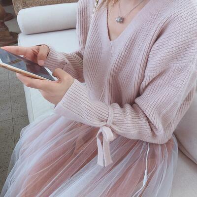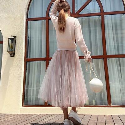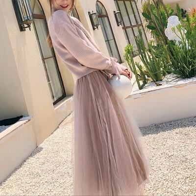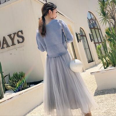 全2色 可愛いセットアップ レディース カジュアル きれいめ おしゃれ スカートセット ニット セーター チュールスカート 長袖 フェミニン 着回し レイヤード ツーピース ウエストゴム リボン ミモレ丈 ピンク ブルー 青 春 秋 冬 20代 30代 40代 50代