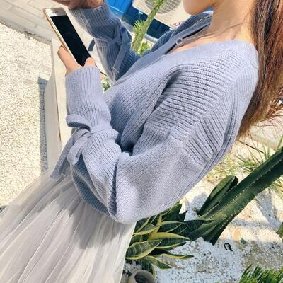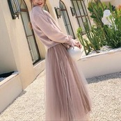 Vネックのニットとチュールスカートのセットアップ。