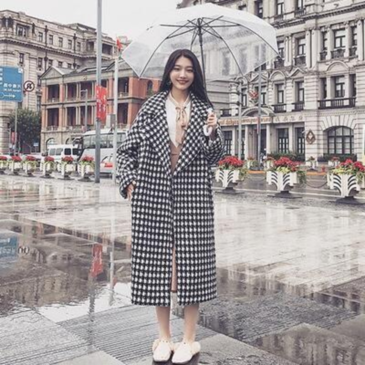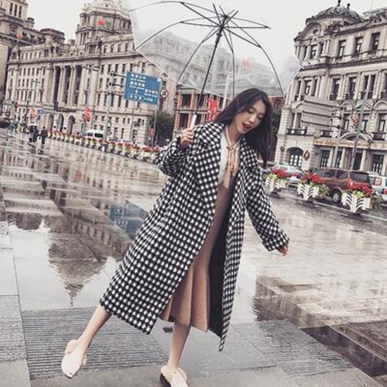 上品に着こなせる千鳥格子柄のチェスターコート。