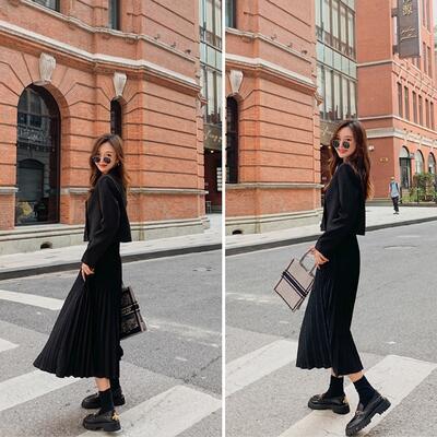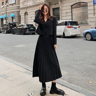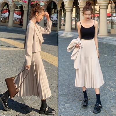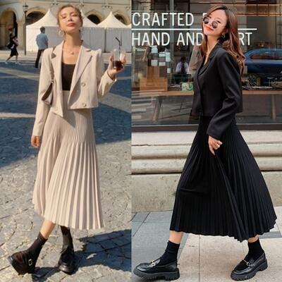全2色 プリーツスカート セットアップ レディース カジュアル きれいめ おしゃれ スカートセット ジャケット スカート 長袖 フェミニン 着回し レイヤード ツーピース 可愛い かっこいい ウエストゴム ミモレ丈 ブラック 黒 カーキ 大きいサイズ 春 秋 冬 20代 30代 40代 50代