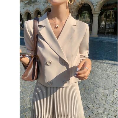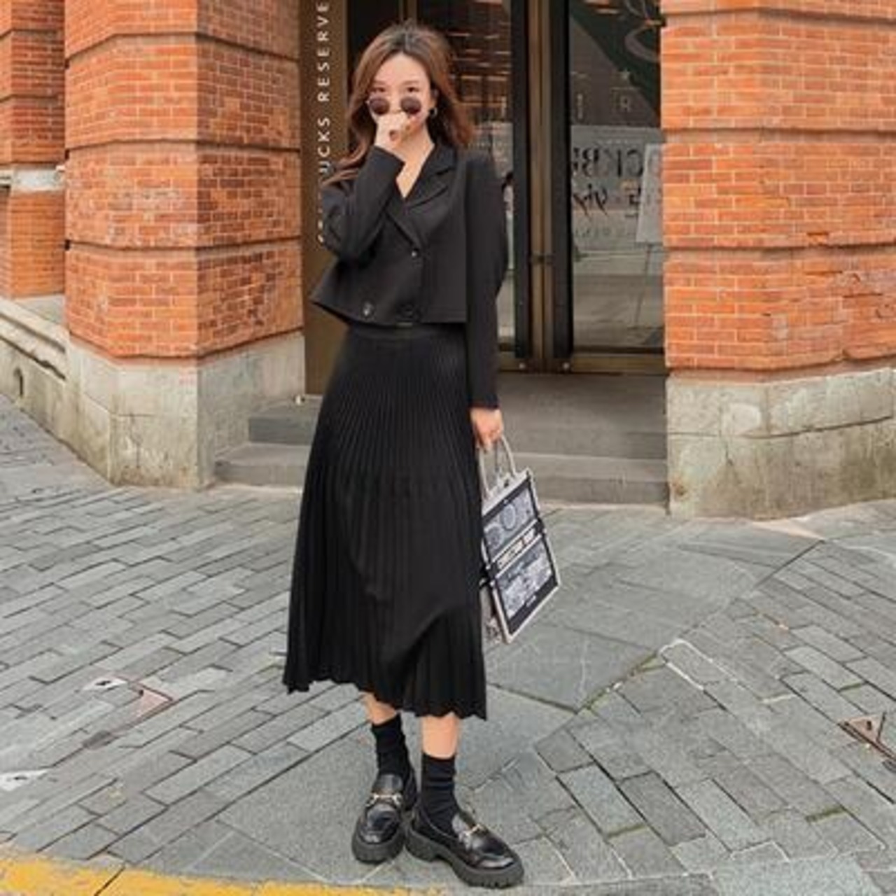 ショートジャケットとプリーツスカートのセットアップ。