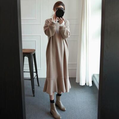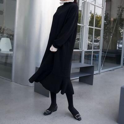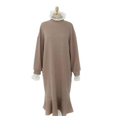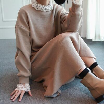 全2色 大きいサイズ ティアード フレアレイヤード ワンピース ニットワンピ ロングワンピ レース レディース 袖あり 長袖 きれいめ カジュアル マーメイドシルエット ミモレ丈 おしゃれ 可愛い ゆったり フェミニン ワンピ ドレス ブラック 黒 カーキ 春 秋 冬 20代 30代 40代 50代