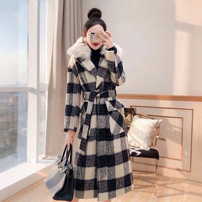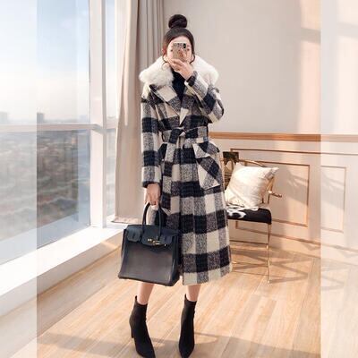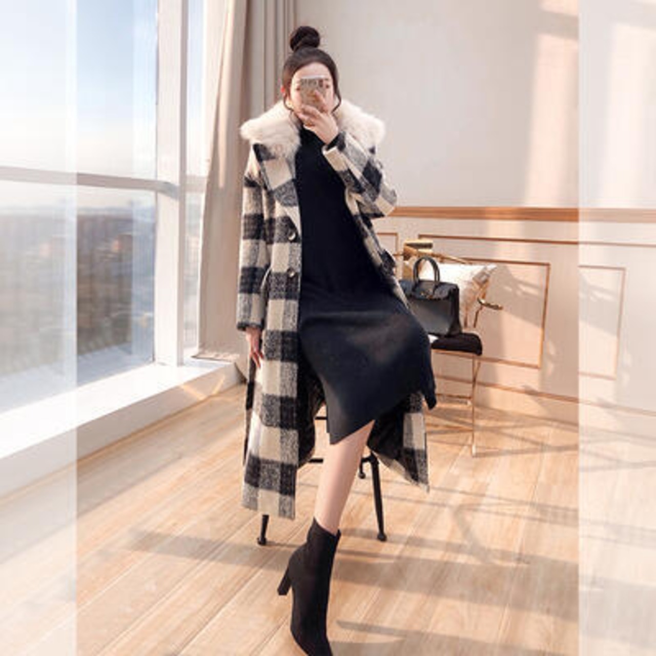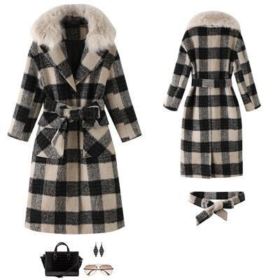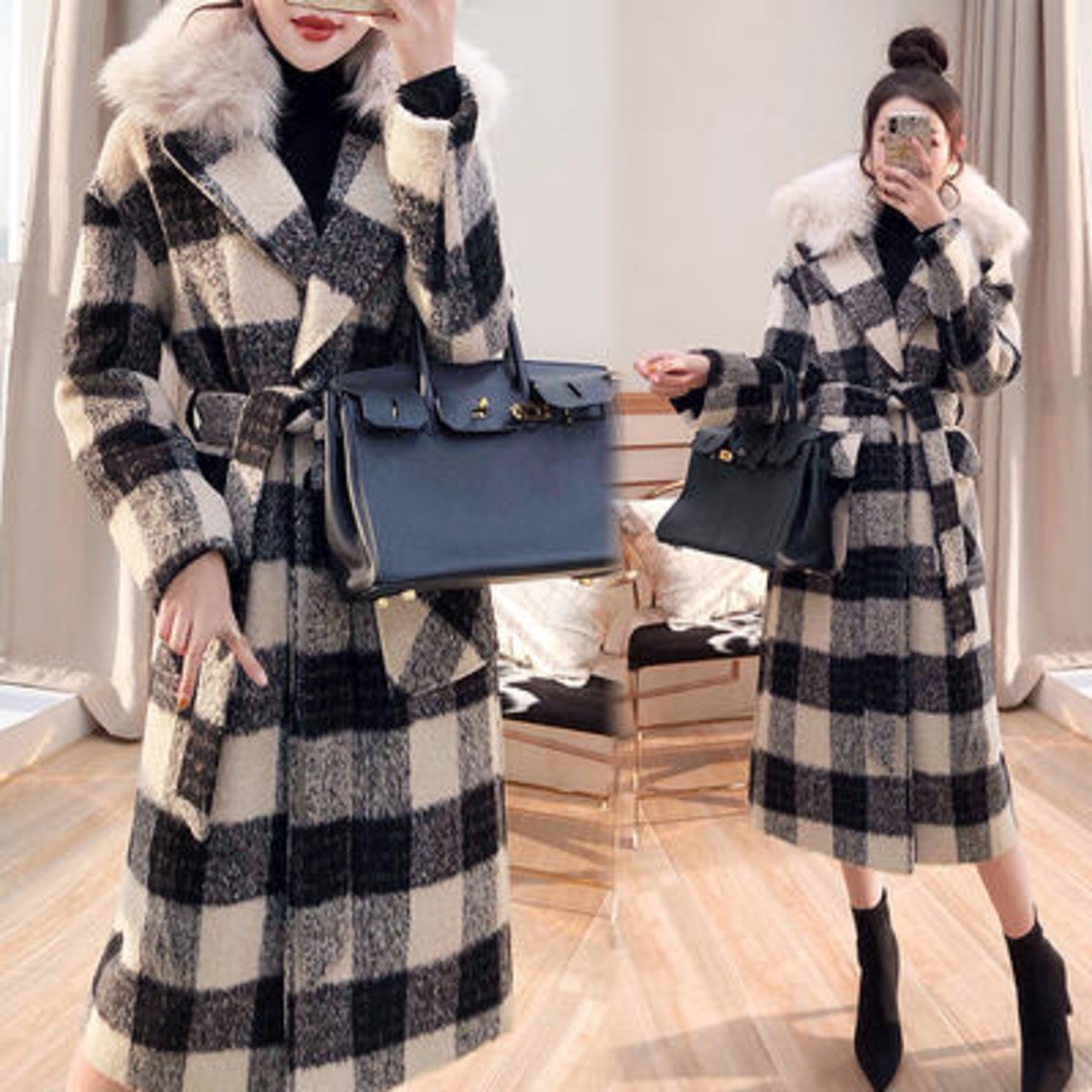 首周りのファーが華やかな雰囲気のチェック柄コート。