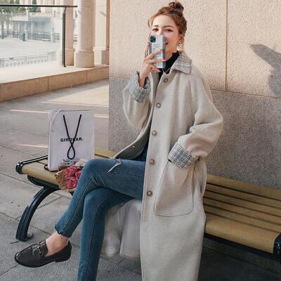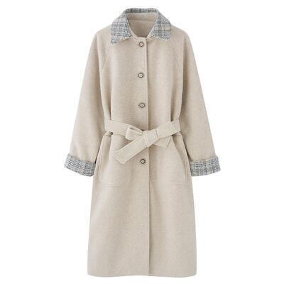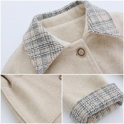 襟と袖口にチェック柄を使用したステンカラーコート。