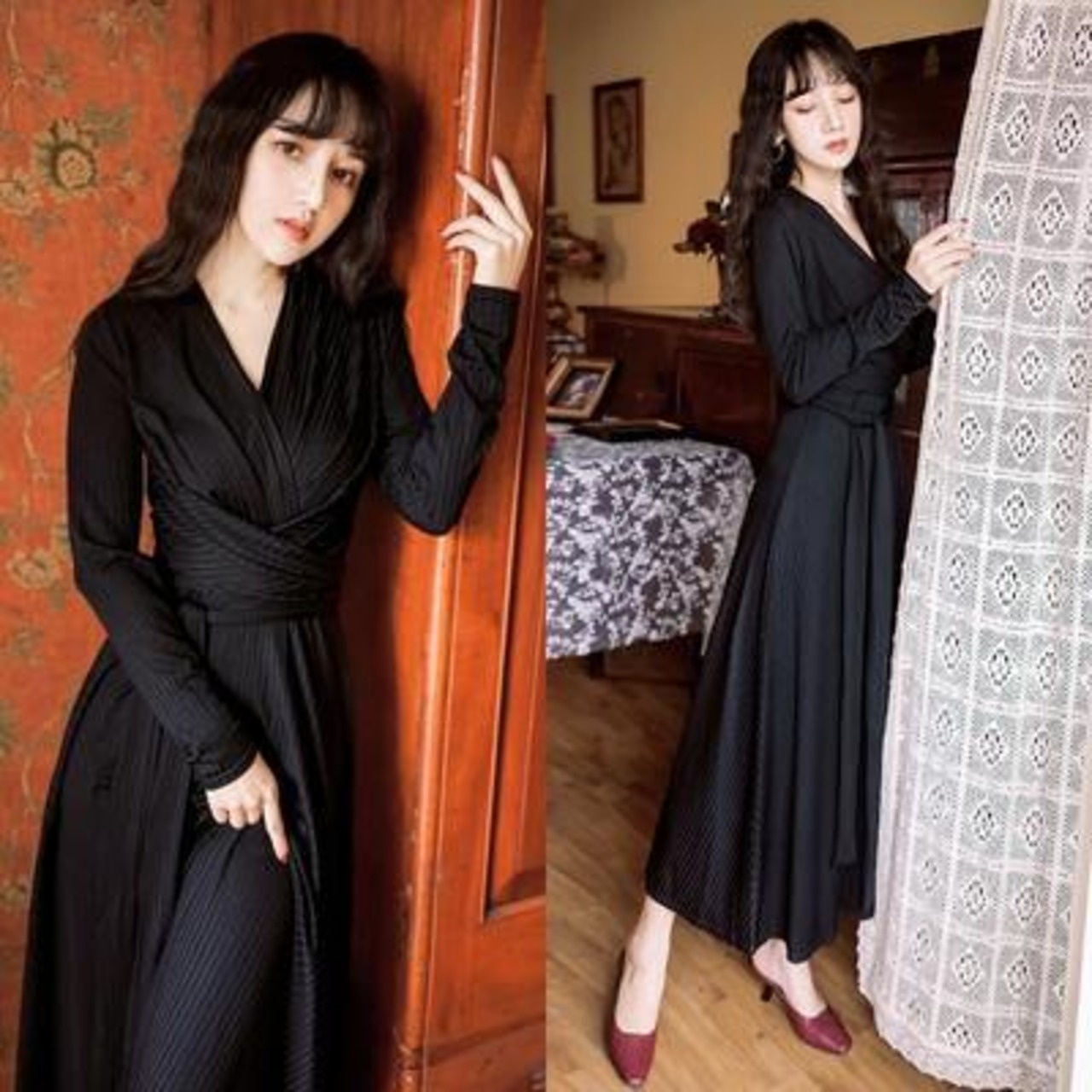 全2色 ニット ワンピース エレガント 袖あり きれいめ カジュアル ロング丈 おしゃれ レディース 可愛い フェミニン 長袖 ワンピ ドレス カシュクール Vネック ハイウエスト お呼ばれ 二次会 ブラック 黒 レッド 赤 春 秋 夏 20代 30代 40代 50代