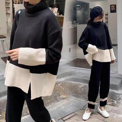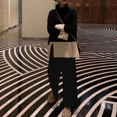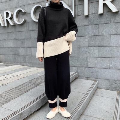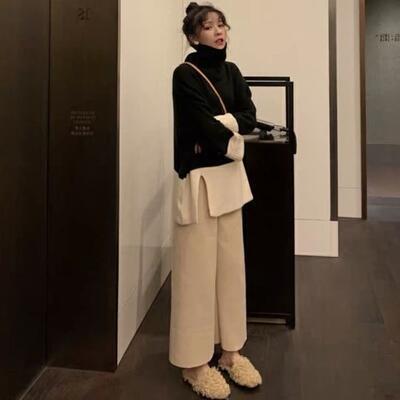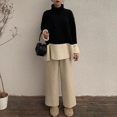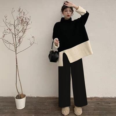 全2種2色 ゆったり リラックス 体型カバー オーバーサイズ セットアップ 2点セット レディース カジュアル きれいめ おしゃれ トップス パンツ ニット タートルネック 長袖 フェミニン ワイドパンツ バイカラー 着回し ツーピース エレガント 大きいサイズ ブラック 黒 ベージュ 春 秋 冬 20代 30代 40代 50代