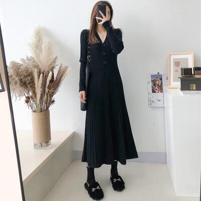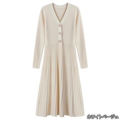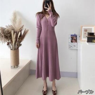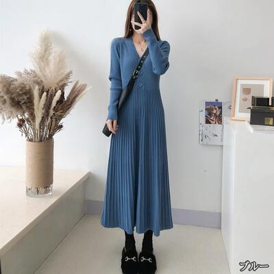 全5色 大きいサイズ Aラインニット ワンピース エレガント 袖あり きれいめ カジュアル ミモレ丈 おしゃれ レディース 可愛い フェミニン 長袖 ワンピ ドレス ロングワンピ Vネック ハイウエスト ベージュ ブルー ブラック 黒 パープル カーキ 春 秋 夏 20代 30代 40代 50代