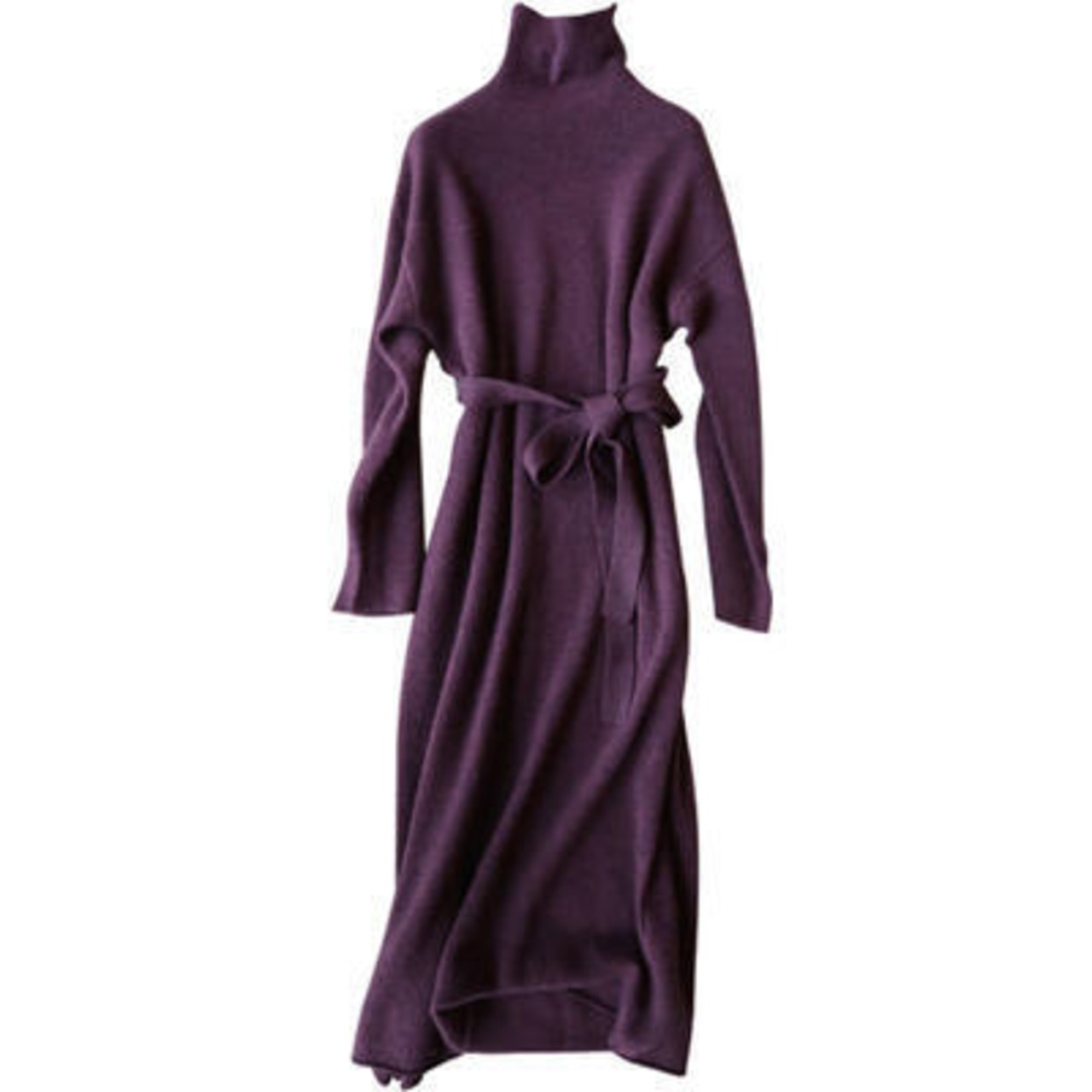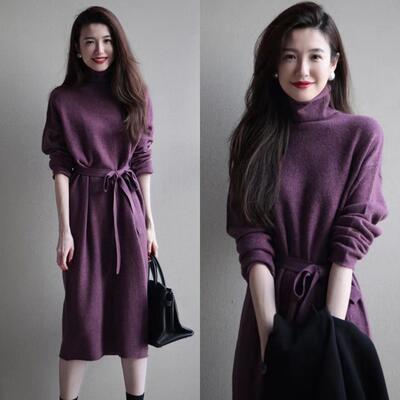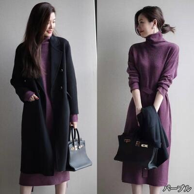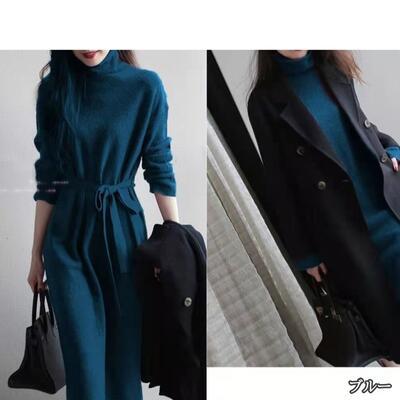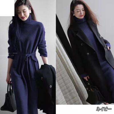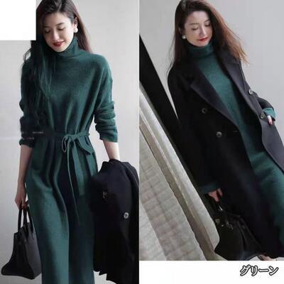 全5色 ニット ワンピース エレガント 袖あり きれいめ カジュアル ミモレ丈 おしゃれ レディース 可愛い フェミニン 長袖 タートルネック ワンピ ドレス ロングワンピ ウエストリボン グリーン ブルー ネイビー パープル レッド 春 秋 冬 20代 30代 40代 50代