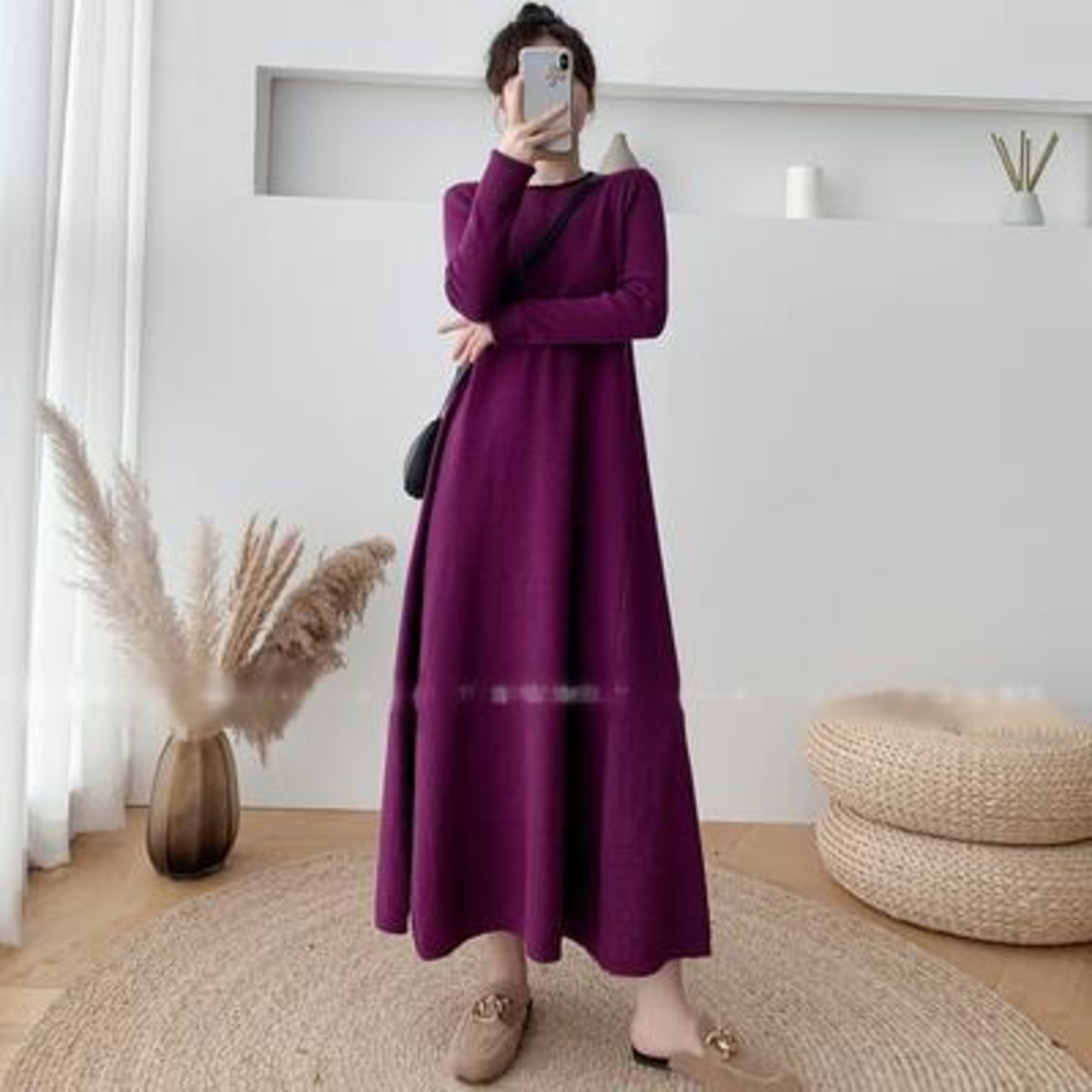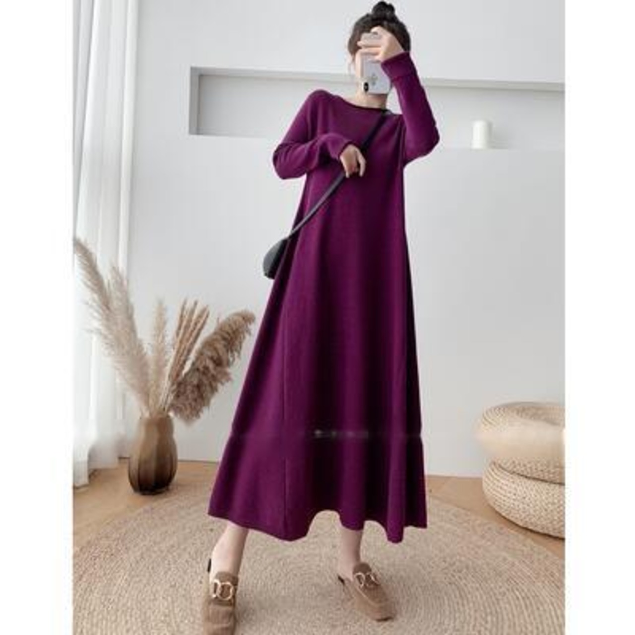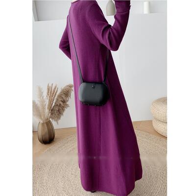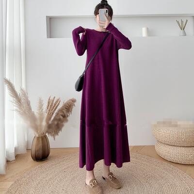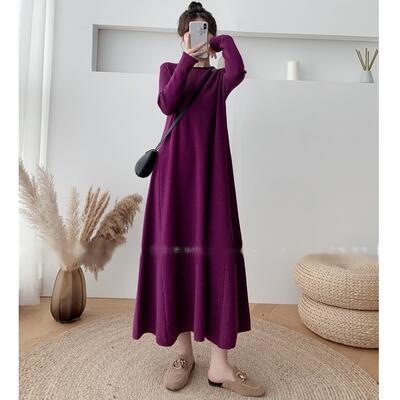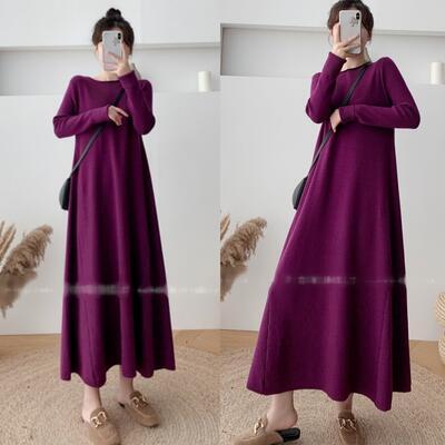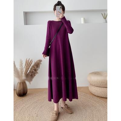 ニット ワンピース エレガント 袖あり きれいめ カジュアル ロング丈 おしゃれ レディース 可愛い フェミニン 長袖 ワンピ ドレス ロングワンピ ゆったり Aライン 体型カバー シンプル ナチュラル パープル 春 秋 冬 20代 30代 40代 50代