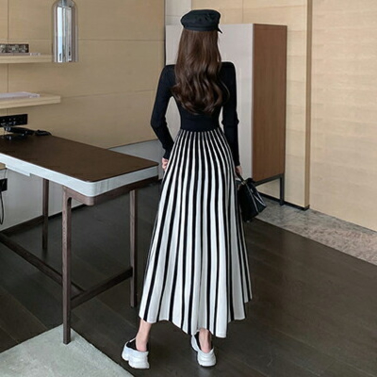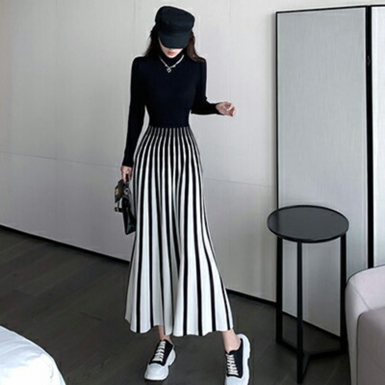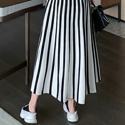 ストライプが印象的なニットワンピース。