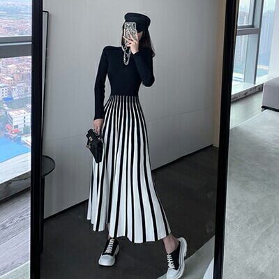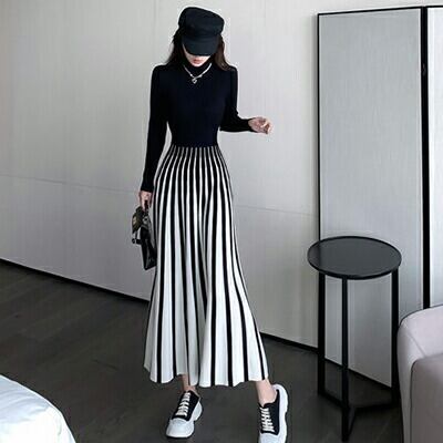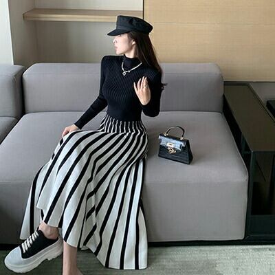 大きいサイズ ニット ワンピース ロングワンピ 袖あり きれいめ カジュアル ロング丈 おしゃれ レディース 可愛い モード 長袖 ワンピ ドレス Aライン ハイネック ストライプ ゆったり シンプル 体型カバー ブラック コーデ 春 秋 冬 20代 30代 40代 50代