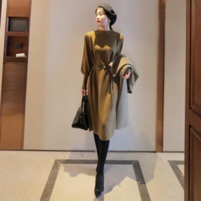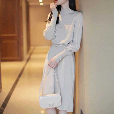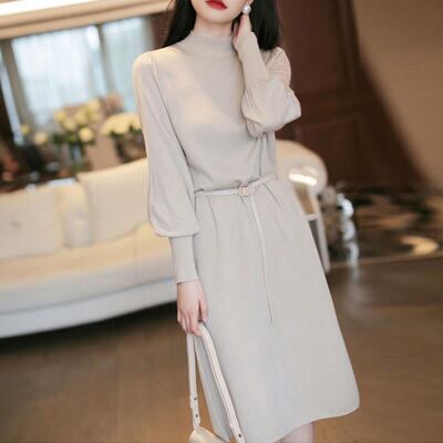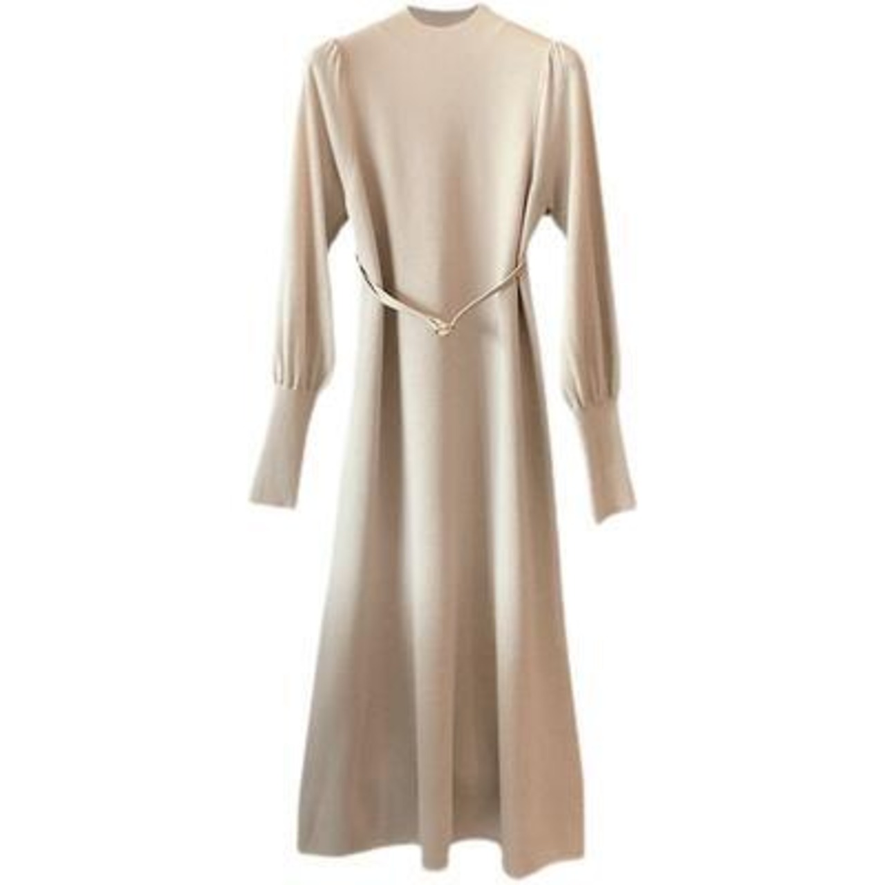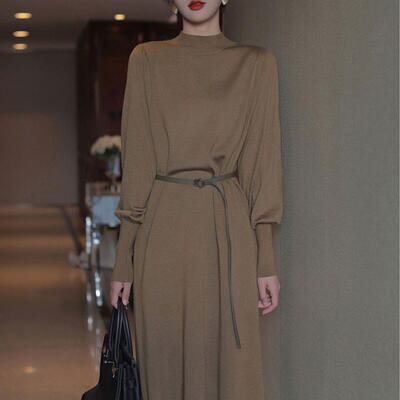 全3色 大きいサイズ ニット ワンピース ミモレ丈 袖あり きれいめ カジュアル ひざ丈 おしゃれ レディース 可愛い フェミニン 長袖 ワンピ ドレス ハイネック ウエストベルト ゆったり シンプル 体型カバー グリーン ブラック 黒 ベージュ 春 秋 冬 20代 30代 40代 50代