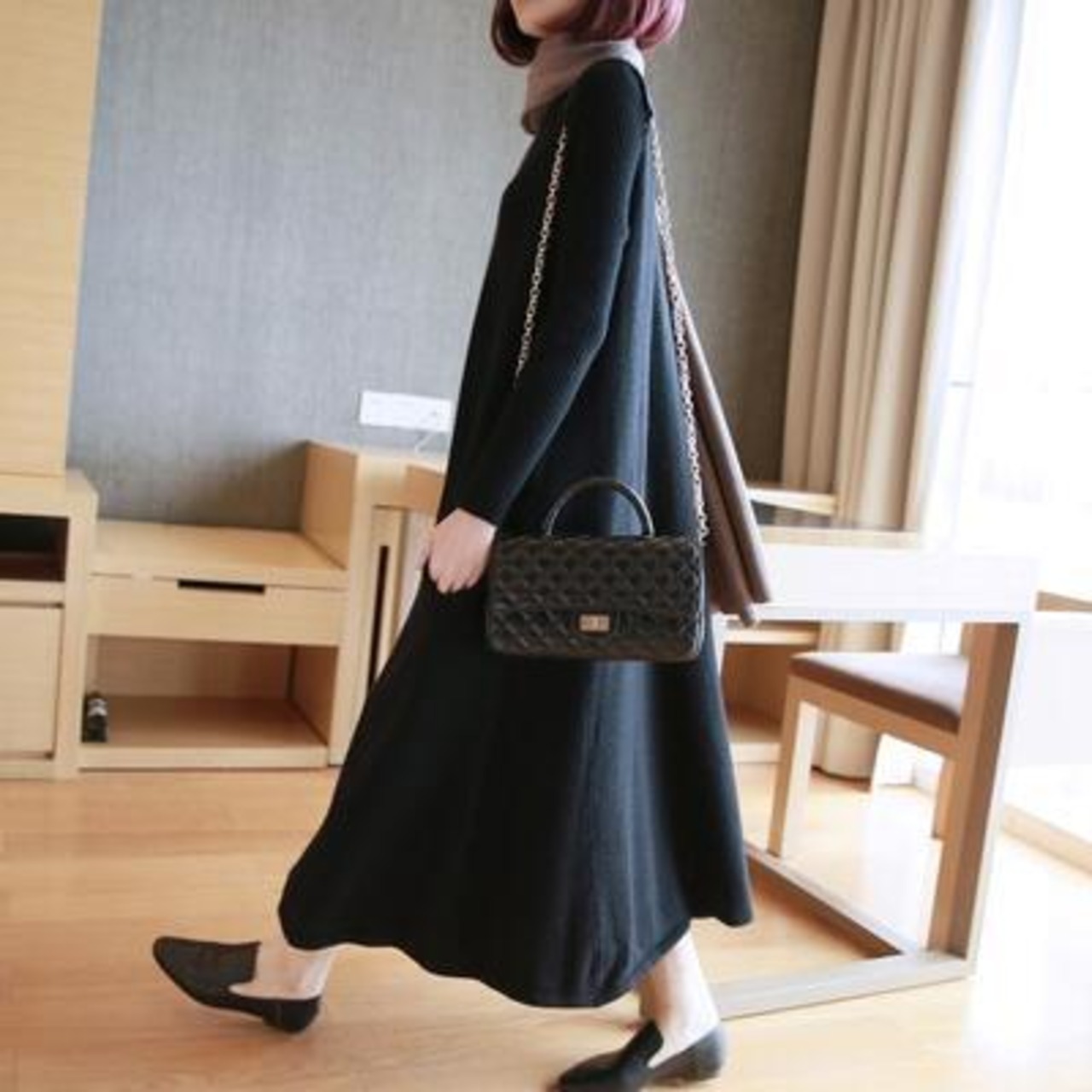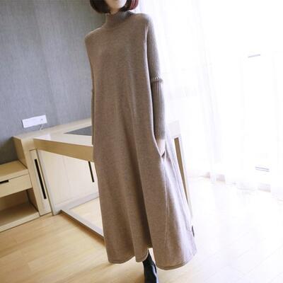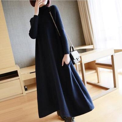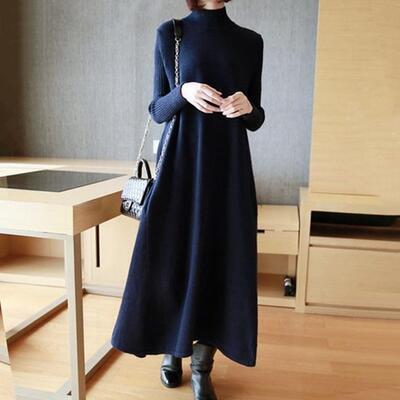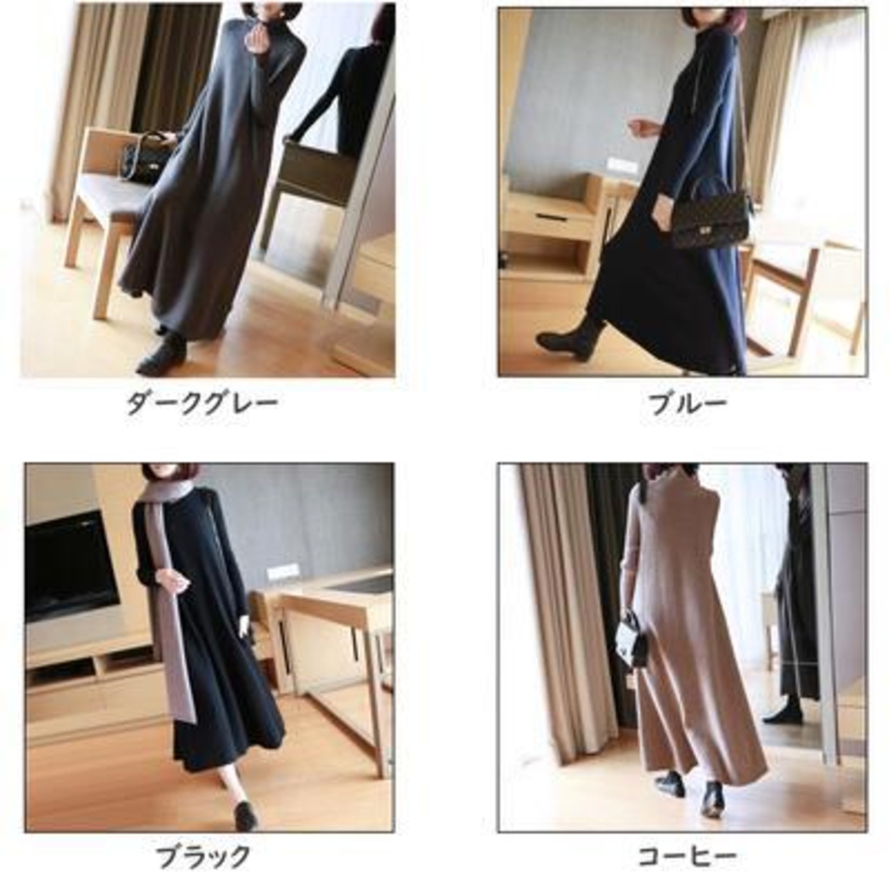 全4色 シンプル ウール混 ニット ワンピース ロングワンピ 袖あり きれいめ カジュアル ロング丈 おしゃれ レディース ハイネック 可愛い フェミニン 長袖 ワンピ ドレス Aライン 体型カバーゆったり ブルー ブラウン ブラック 黒 グレー 春 秋 冬 20代 30代 40代 50代