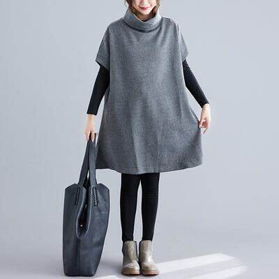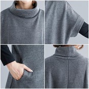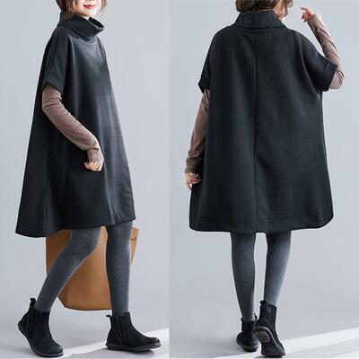 全2色 リラックスレイヤード ニット ワンピース ショートワンピ チュニック トップス 袖あり カジュアル ショート丈 おしゃれ レディース ハイネック 可愛い フェミニン 半袖 ワンピ ドレス 体型カバーゆったり ブラック 黒 グレー 春 秋 冬 20代 30代 40代 50代