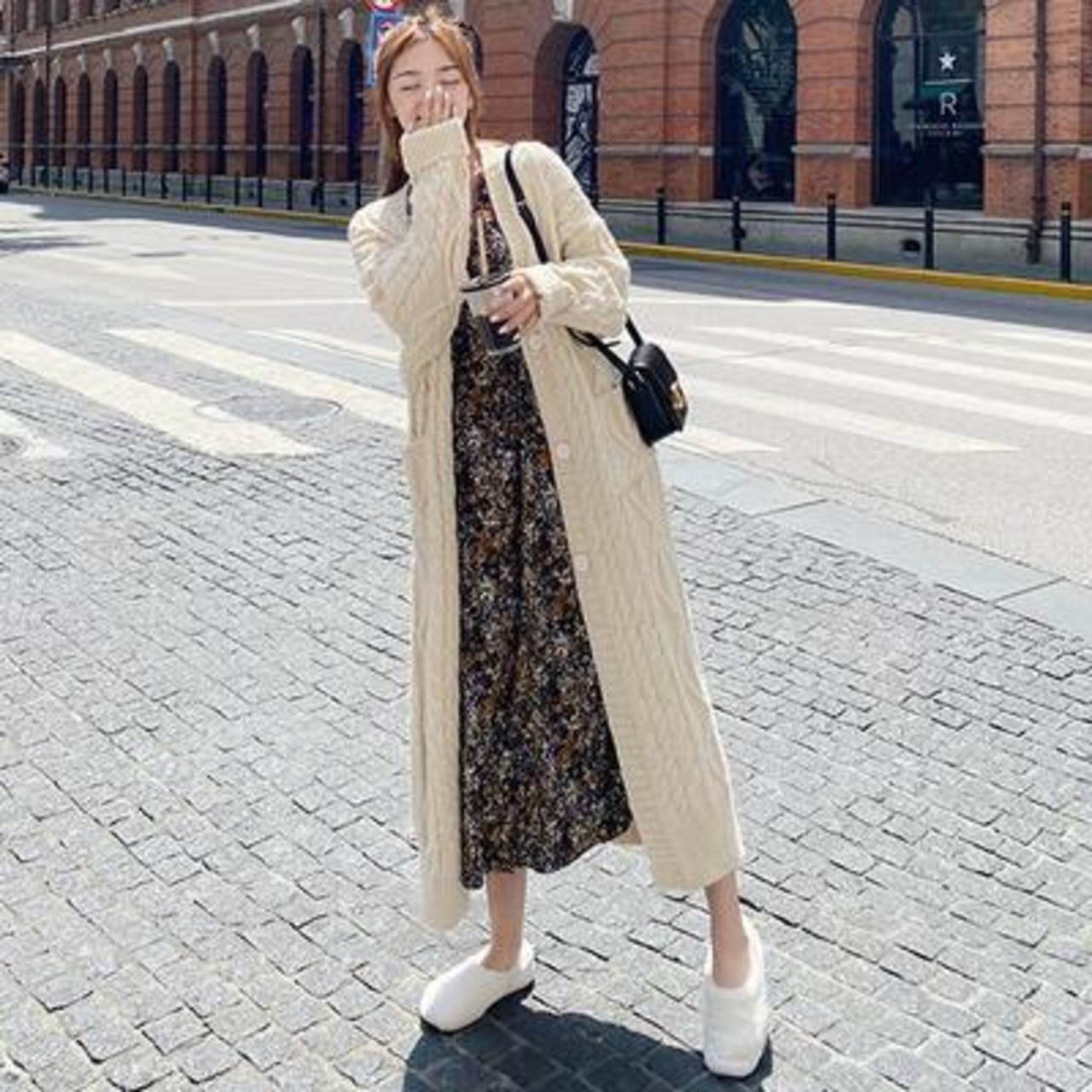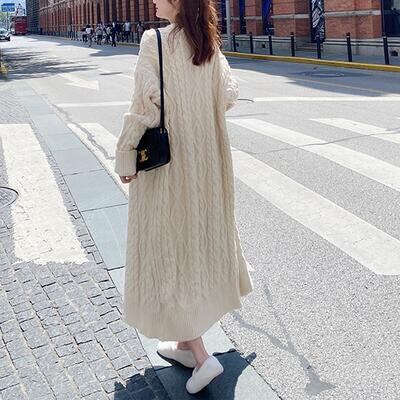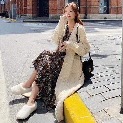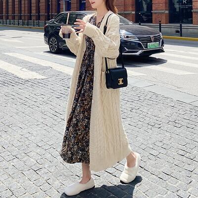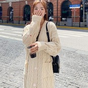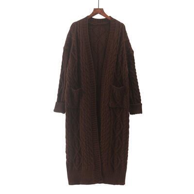 ロング丈のケーブル編みニットカーディガン。
