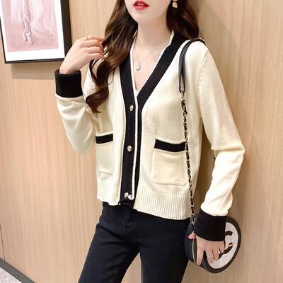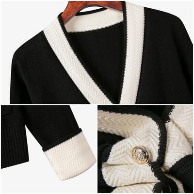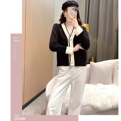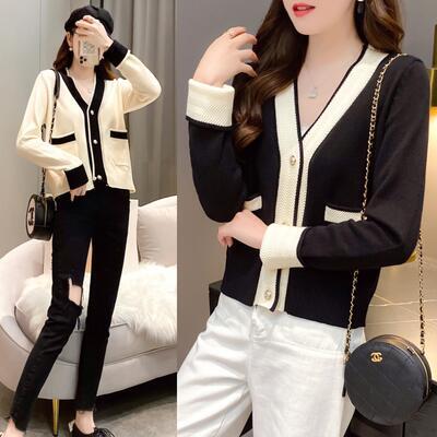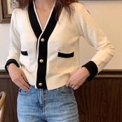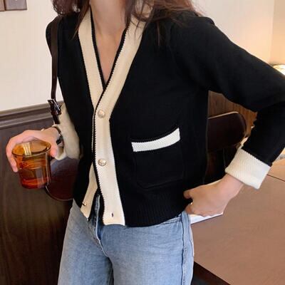 全2色 トップス レディース カーディガン ニット きれいめ カジュアル 長袖 羽織 おしゃれ 可愛い フェミニン Vネック ショート丈 エレガント オフィス 大きいサイズ バイカラー ブラック 黒 ホワイト 白 秋 春 冬 20代 30代 40代 50代