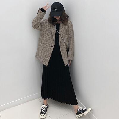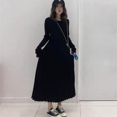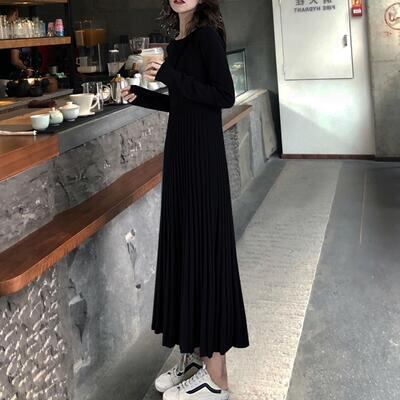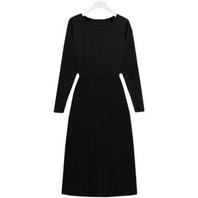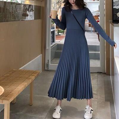 全2色 ニット ワンピース ロングワンピ 袖あり きれいめ カジュアル ロング丈 おしゃれ レディース プリーツ 可愛い フェミニン 長袖 ワンピ ドレス Aライン ハイウエスト 大きいサイズ シンプル ブルー 青 ブラック 黒 春 秋 冬 20代 30代 40代 50代