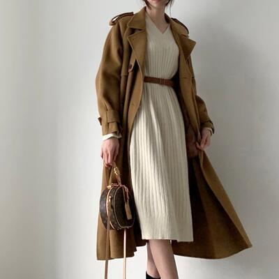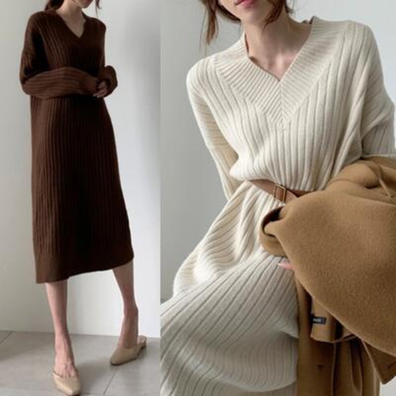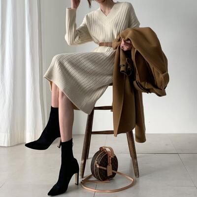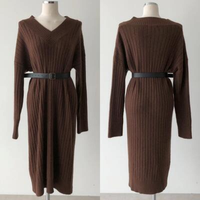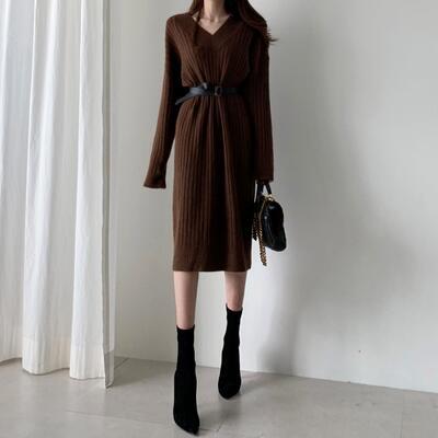全2色 Vネック ひざ丈 ニット ワンピース 袖あり きれいめ カジュアル ミモレ丈 おしゃれ レディース リブ 可愛い フェミニン 長袖 ワンピ ドレス Aライン ウエストベルト 大きいサイズ シンプル ブラウン ホワイト 白 春 秋 冬 20代 30代 40代 50代