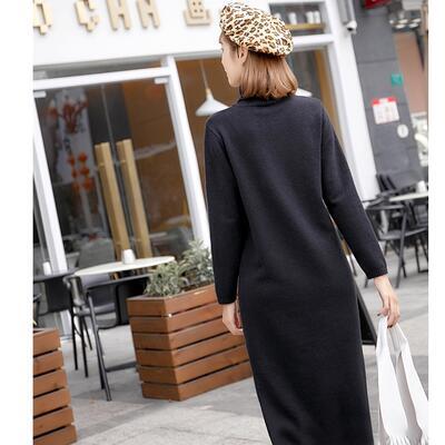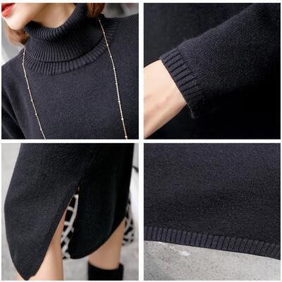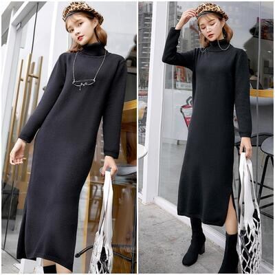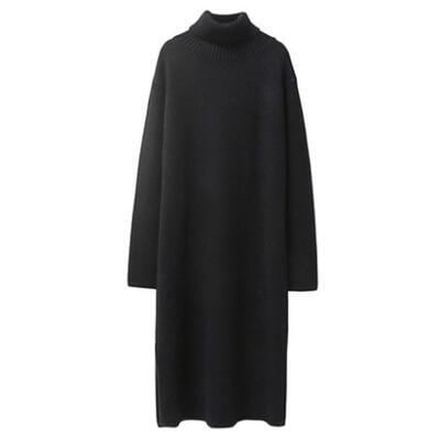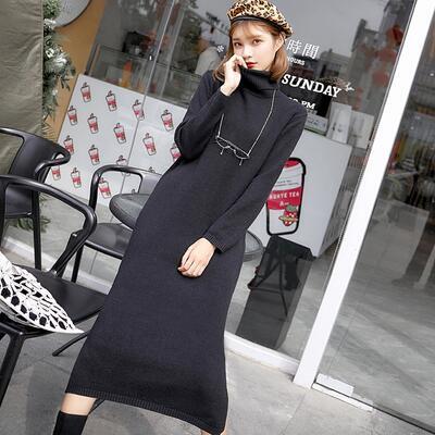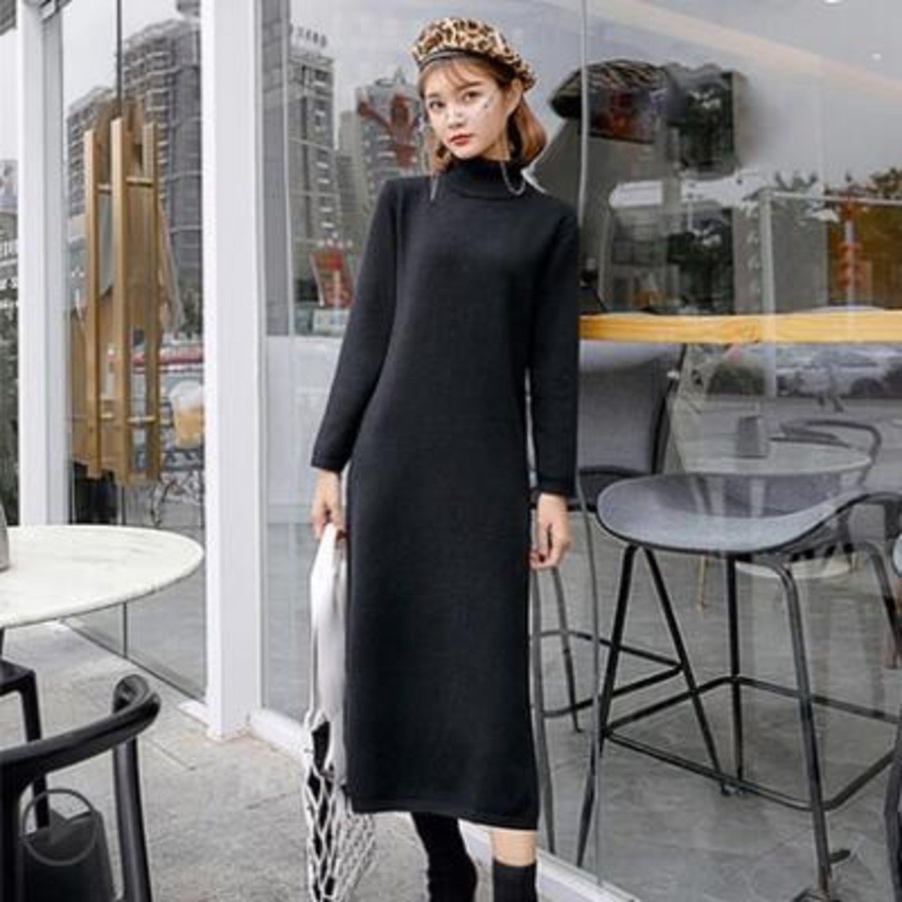 シンプルで着回しやすいタートルネックのニットワンピース。