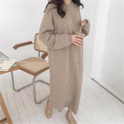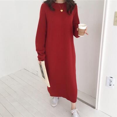 全4色 大きいサイズ ニット ワンピース 袖あり きれいめ カジュアル ロング丈 おしゃれ レディース 可愛い ミモレ丈 フェミニン 長袖 ワンピ ドレス ゆったり クルーネック シンプル カーキ レッド 赤 グレー ブラック 黒 春 秋 冬 20代 30代 40代 50代