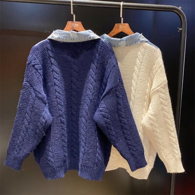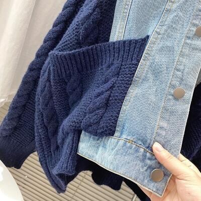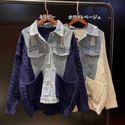 全2色 ニットジャケット デニム ミドル丈 アウター 切り替え レディース カーディガン きれいめ カジュアル ドッキング おしゃれ 可愛い かっこいい ゆったり オーバーサイズ ジャケット ホワイト 白 ネイビー 春 秋 冬 20代 30代 40代 50代