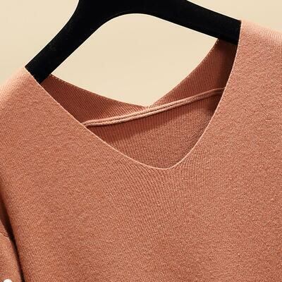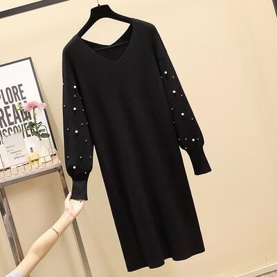 全3色 大きいサイズ ニット ワンピース 袖あり きれいめ パフスリーブ カジュアル ミモレ丈 おしゃれ レディース 可愛い ロングワンピ フェミニン 長袖 ワンピ ドレス パール Vネック ゆったり リラックス レッド ホワイト 白 ブラック 黒 春 秋 冬 20代 30代 40代 50代