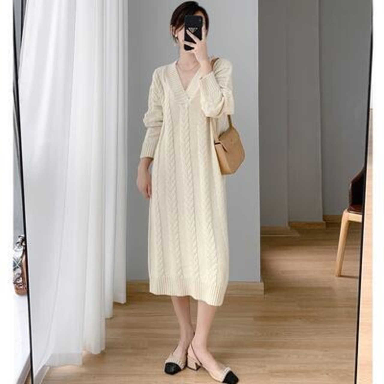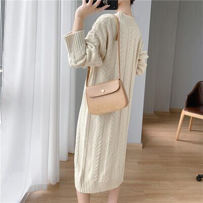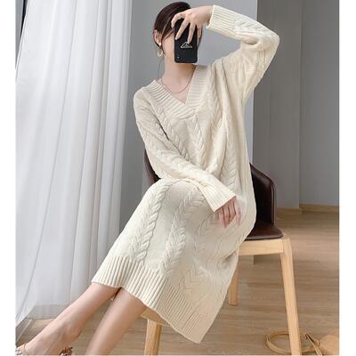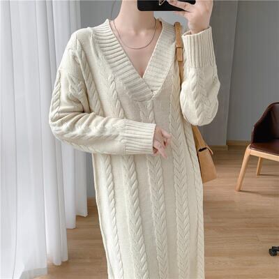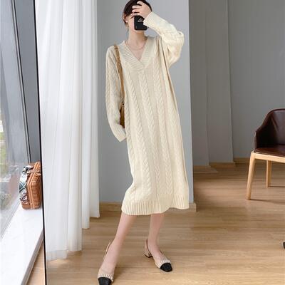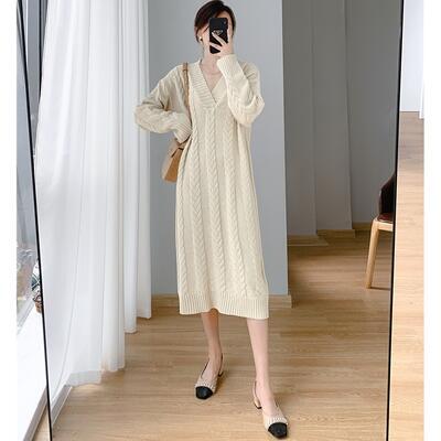 ニット ワンピース 袖あり カジュアル ミモレ丈 ケーブル編み おしゃれ レディース 可愛い ロングワンピ フェミニン 長袖 ワンピ ドレス ゆったり 体型カバー Vネック シンプル リラックス きれいめ ベージュ 春 秋 冬 20代 30代 40代 50代