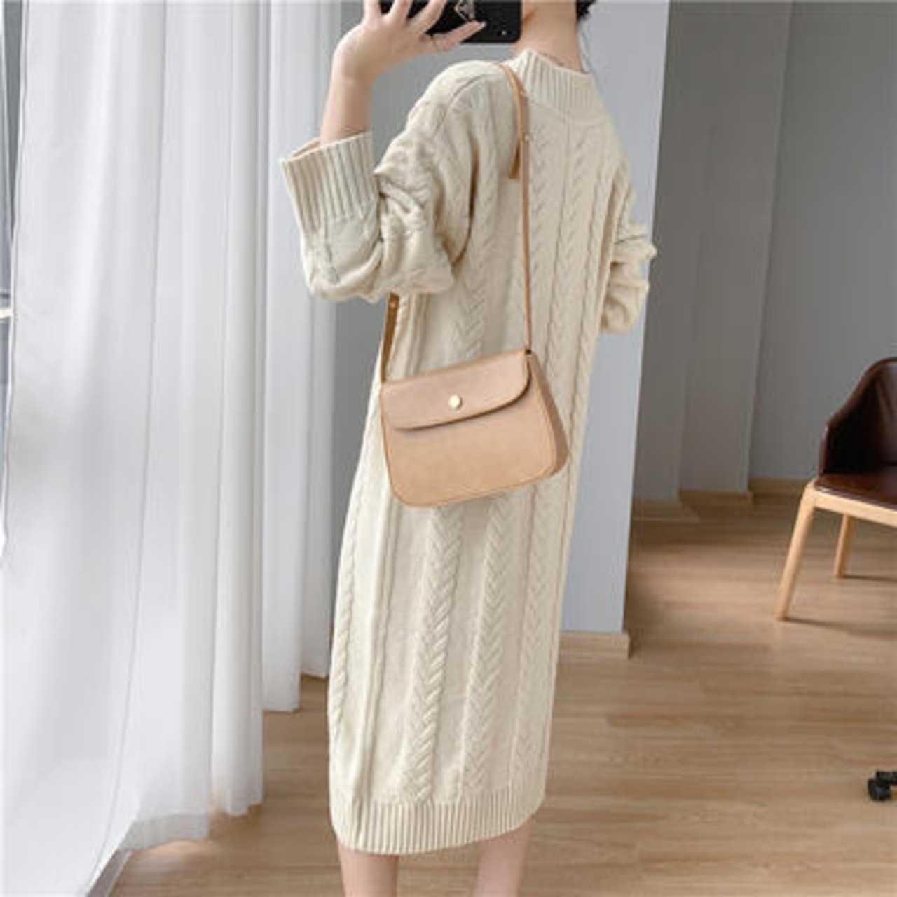 シンプルで着回しやすいケーブル編みのニットワンピース。