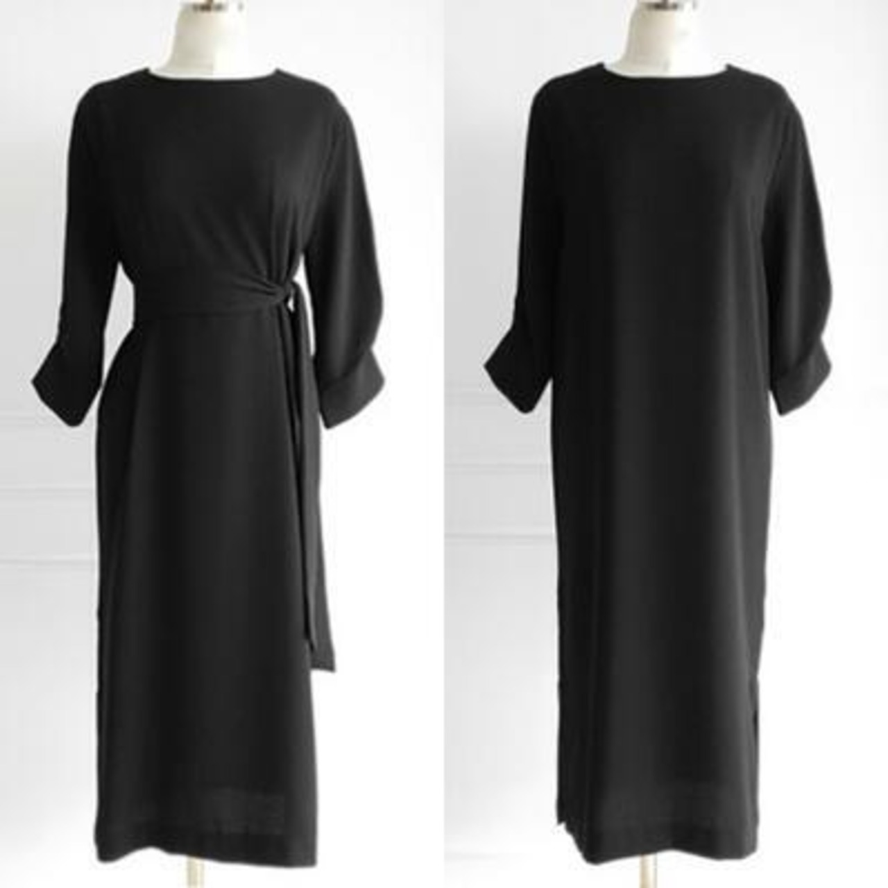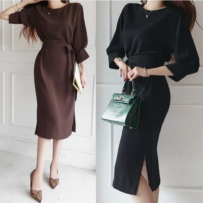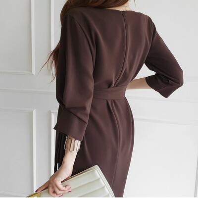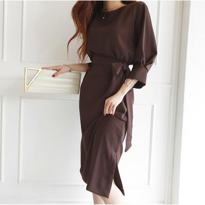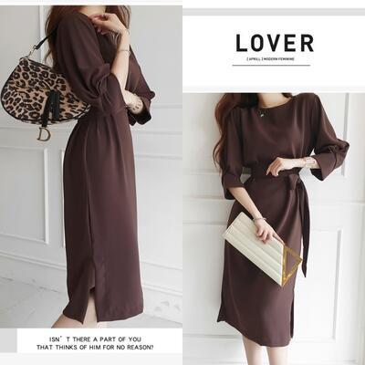 全2色 大きいサイズ 七分袖 クラシカルワンピース ロングワンピ きれいめ カジュアル ミモレ丈 おしゃれ レディース 可愛い エレガント ボリューム袖 フェミニン ワンピ ドレス ゆったり ウエストリボン 体型カバー お呼ばれ ブラウン ブラック 黒 春 秋 冬 20代 30代 40代 50代