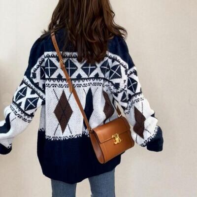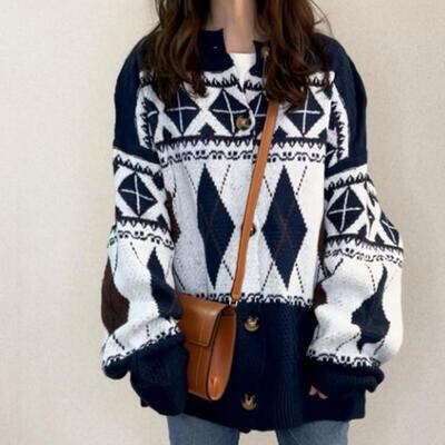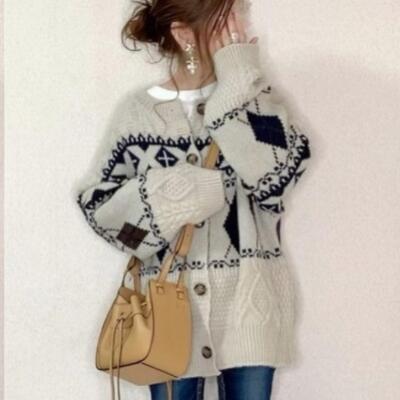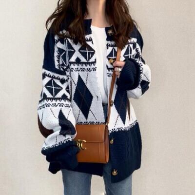 全2色 カーディガン ノルディック柄 アーガイル柄 アウター レディース ジャケット ニット セーター トップス カジュアル 羽織 おしゃれ 長袖 可愛い 体型カバー ゆったり オーバーサイズ レトロ ネイビー アイボリー 秋 春 冬 20代 30代 40代 50代