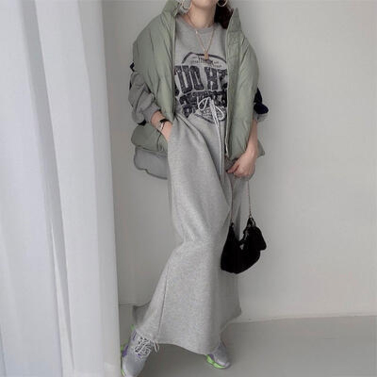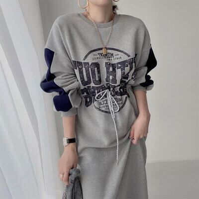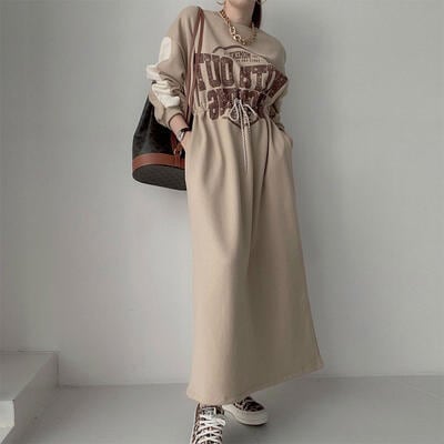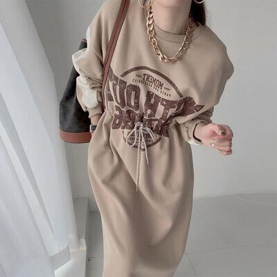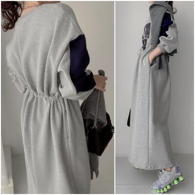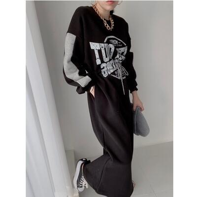 全3色 ワンピース ロングワンピ スポーティ カジュアル ミモレ丈 ロゴ おしゃれ レディース 可愛い ドロスト フェミニン ワンピ ドレス ハイウエスト かっこいい スウェットワンピ 体型カバー ベージュ グレー ブラック 黒 春 秋 冬 20代 30代 40代 50代