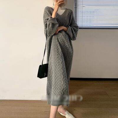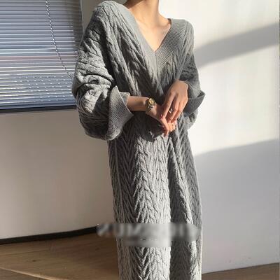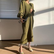 全2色 可愛い フェミニン ワンピ ゆったり 体型カバー ニット ワンピース ロングワンピ ケーブル編み カジュアル ミモレ丈 おしゃれ レディース ドレス オーバーサイズ ドロップショルダー グリーン 緑 グレー 春 秋 冬 20代 30代 40代 50代