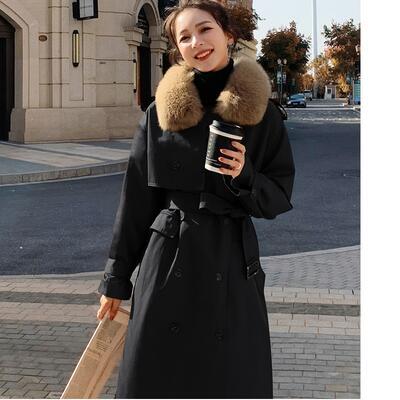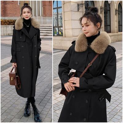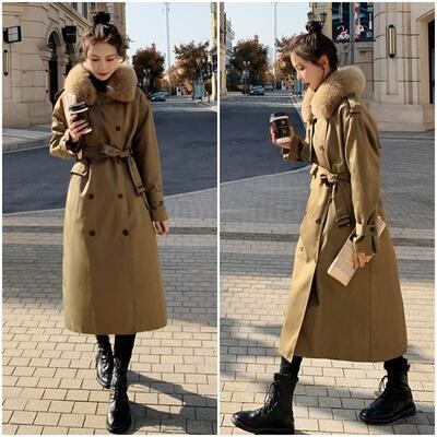 襟のふわふわファーがポイントのトレンチコート。