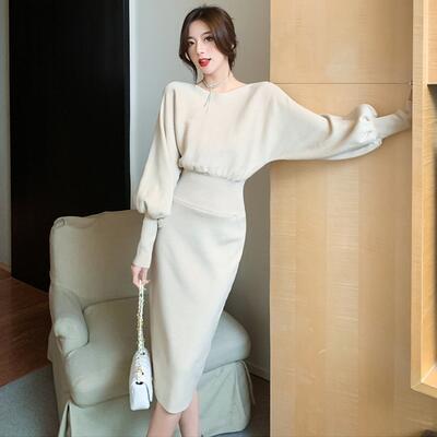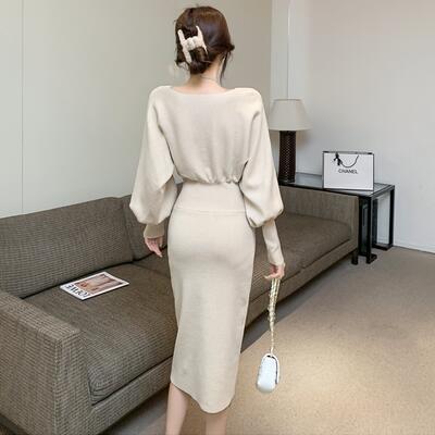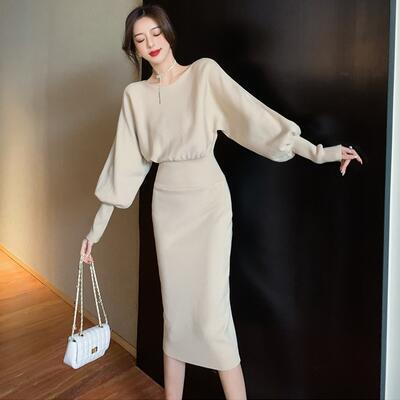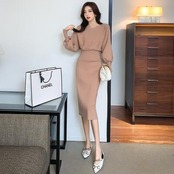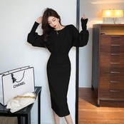 全3色 シンプル パフスリーブ ボリューム袖 ニット ワンピース ロングワンピ ボートネック エレガント きれいめ カジュアル ミモレ丈 おしゃれ レディース ワンピ ドレス タイト 体型カバー ブラック 黒 ピンク ベージュ ホワイト 白 春 秋 冬 20代 30代 40代 50代