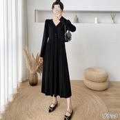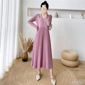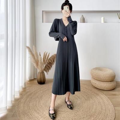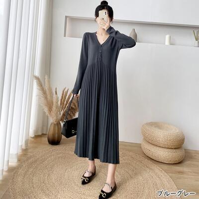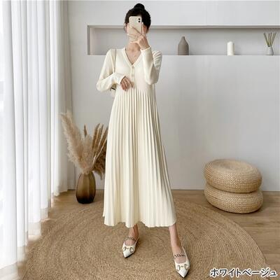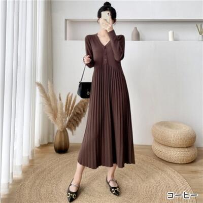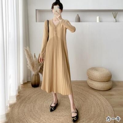 全6色 ニット ワンピース ロングワンピ Vネック きれいめ カジュアル ロング丈 おしゃれ レディース ワンピ ドレス プリーツ Aライン フェミニン シンプル 大きいサイズ ブラック 黒 ベージュ ピンク ブラウン グレー カーキ 春 秋 冬 20代 30代 40代 50代