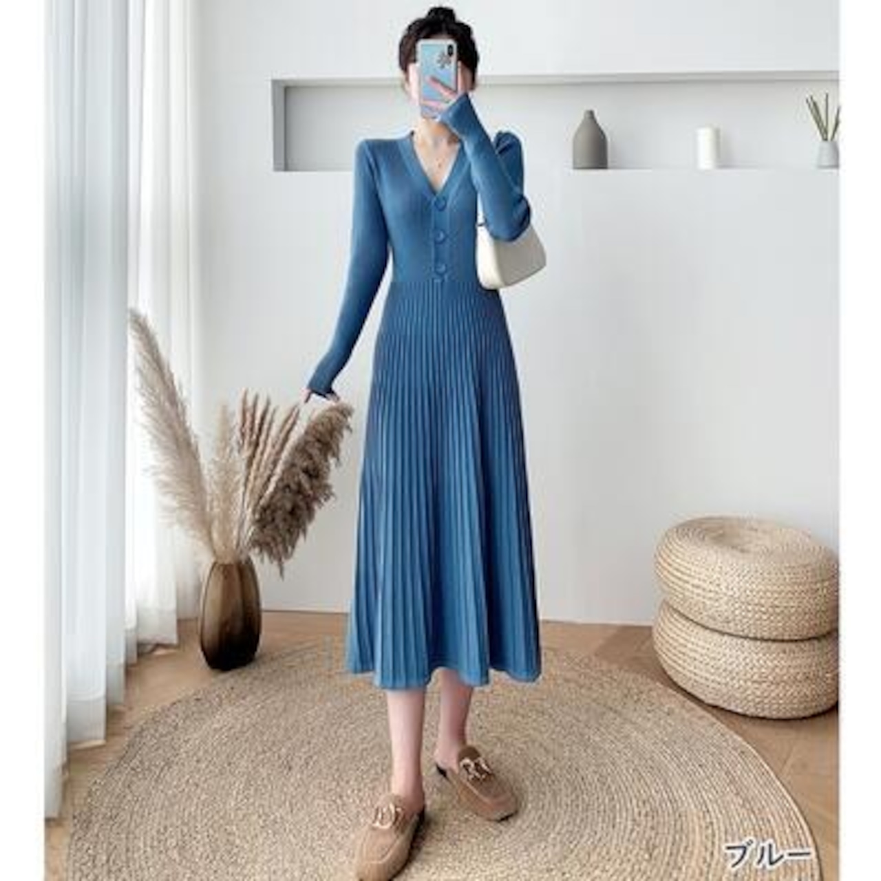 全5色 ニット ワンピース ロングワンピ Vネック きれいめ カジュアル ミモレ丈 おしゃれ レディース ワンピ ドレス Aライン フェミニン シンプル 大きいサイズ ブラック 黒 ベージュ パープル ブルー カーキ 春 秋 冬 20代 30代 40代 50代