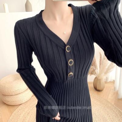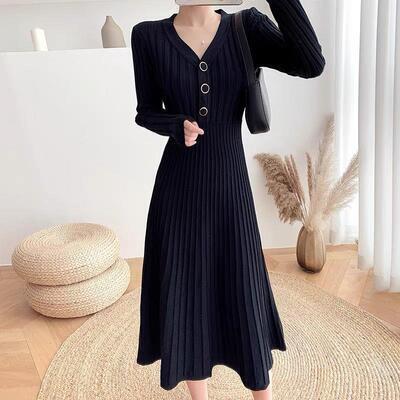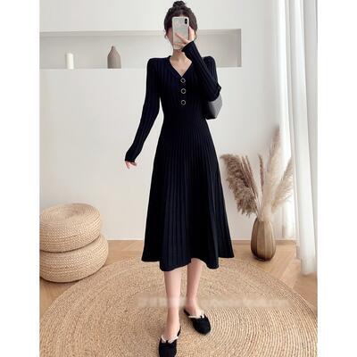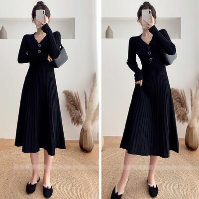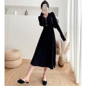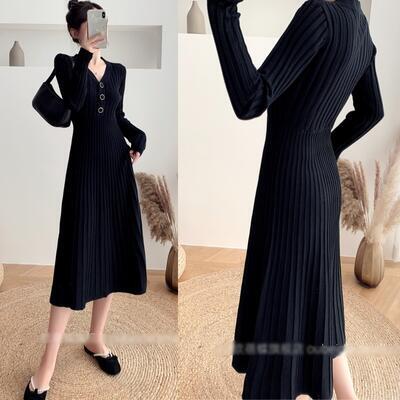 ニット リブ ワンピース ロングワンピ Vネック きれいめ カジュアル ミモレ丈 おしゃれ レディース ワンピ ドレス Aライン フェミニン シンプル ハイウエスト 切り替え エレガント ブラック 黒 春 秋 冬 20代 30代 40代 50代