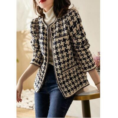 ノーカラー アウター レディース ジャケット コート ツイード きれいめ カジュアル 羽織 カーディガン おしゃれ 長袖 可愛い 千鳥格子 フェミニン シンプル トラッド クラシカル 大きいサイズ ベージュ ネイビー 秋 春 冬 20代 30代 40代 50代