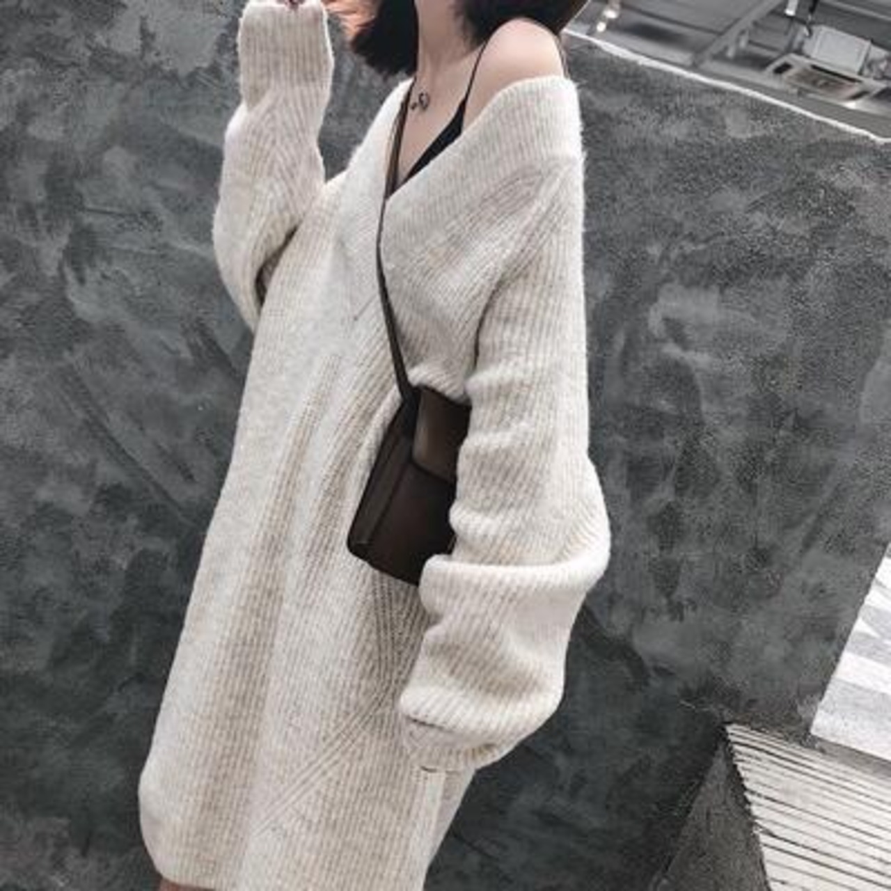 全2色 ニット ワンピース セーター チュニック Vネック きれいめ カジュアル ひざ丈 おしゃれ レディース ワンピ ドレス フェミニン シンプル ゆったり 体型カバー オーバーサイズ ダークグレー ベージュ 春 秋 冬 20代 30代 40代 50代