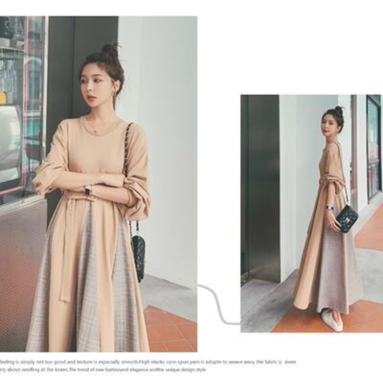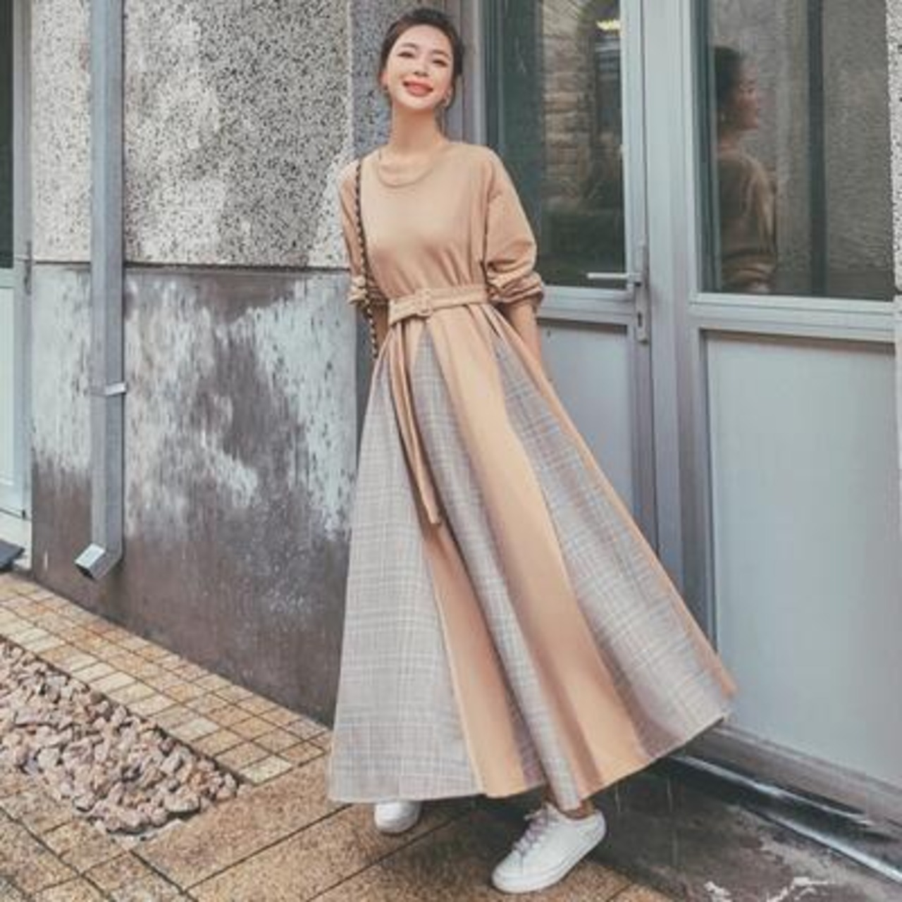 グレンチェックとの切り替えが目を引くロングワンピース。