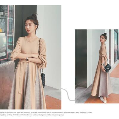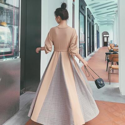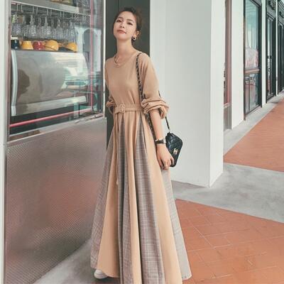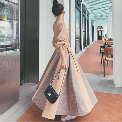 ワンピース ロングワンピ スウェットワンピ 切り替え チェック きれいめ カジュアル フレア おしゃれ レディース ワンピ ドレス フェミニン ハイウエスト ウエストベルト 大きいサイズ カーキ 春 秋 冬 20代 30代 40代 50代
